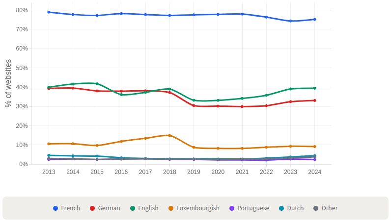 Using CommonCrawl data, I analyzed 83,728 pages of Luxembourg websites from 2013 to 2024, detecting which languages each website offers. I explore language trends over time, multilingual patterns, and the most common language configurations.